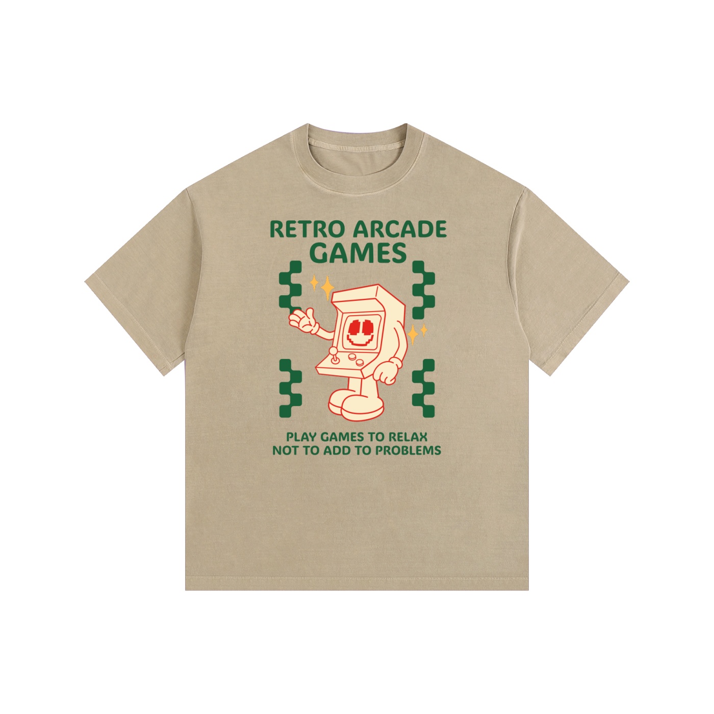 Graphics: Retro Arcade Green & Cream (High-quality screen print style).